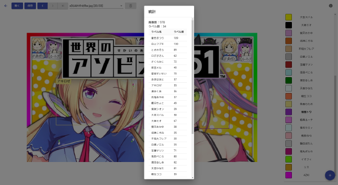 YouTubeのサムネイル画像を900枚程度用意した.各画像にはLive 2Dモデルのメンバーが一人以上写っている.各メンバーにつき30回以上ラベル付けされるように画像数を増やした.ラベル付け回数の確認は下図のような画面を実装して確認した.