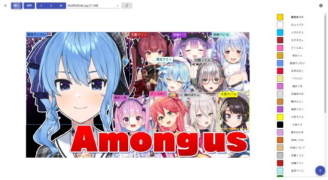 訓練用画像を910枚,検証用画像を68枚用意した.各画像にはLive 2Dモデルのメンバーが一人以上写っている.34ラベルでラベル付けを行った.ラベル付けアプリはelectronで自作した.