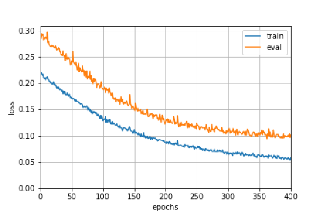 学習済みモデルを用いずに,「Heの初期値」で初期化した状態から学習した.元画像で100epoch+データオーグメンテーションして400epoch回した.後半の400epochの誤差曲線を図に示す.青線がtrain,黄線がeval.バッチサイズは32.Google Colabで19時間程度要した.学習済みモデルのファイルサイズは108MBになった.